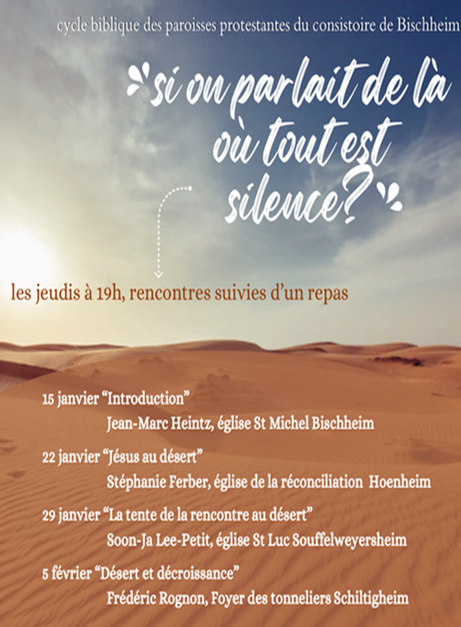 Démarrage de notre cycle biblique consistorial les jeudis, avec une soirée d’introduction au thème du désert le 15 janvier à l’église St Michel de Bischheim à 19h.