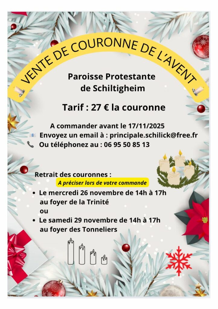 Retrait des couronnes possible le 26/11 ou le samedi 29/11 lors de notre fête de l’Avent de 14h à 17h au Foyer des Tonneliers.